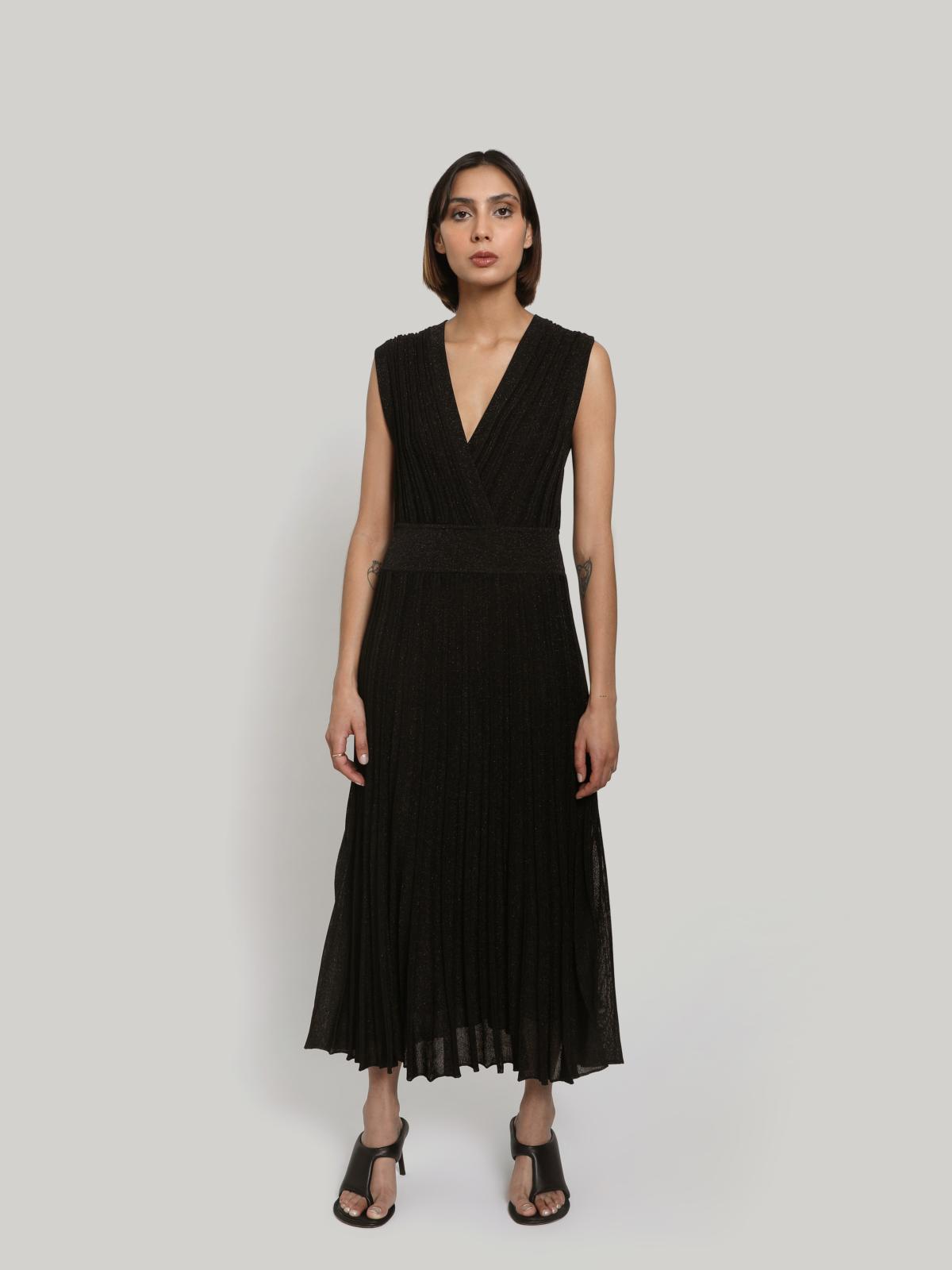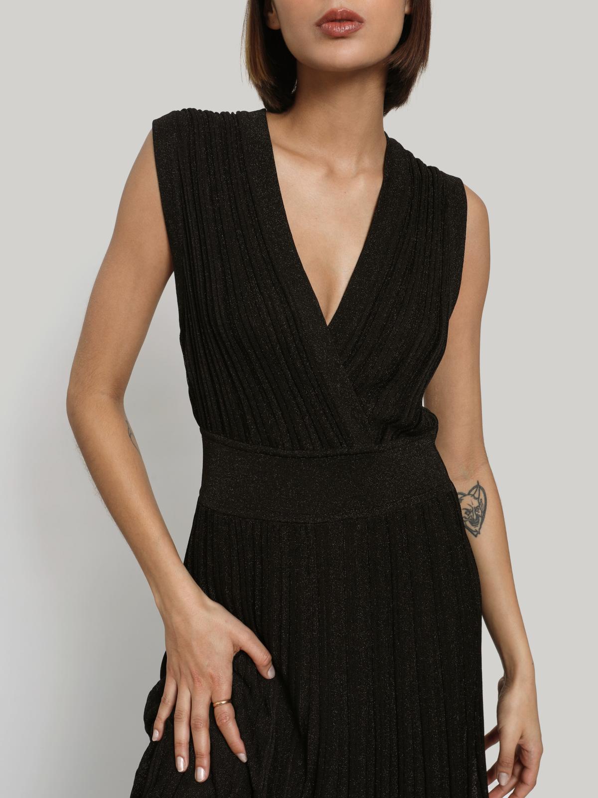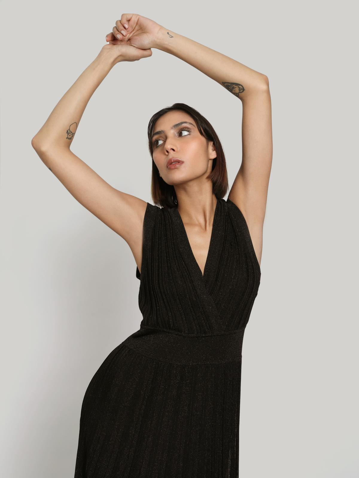 Robe longue plissée tricolore en maille Lurex®, elle possède un décolleté cache-coeur et est élastiquée à la taille.
