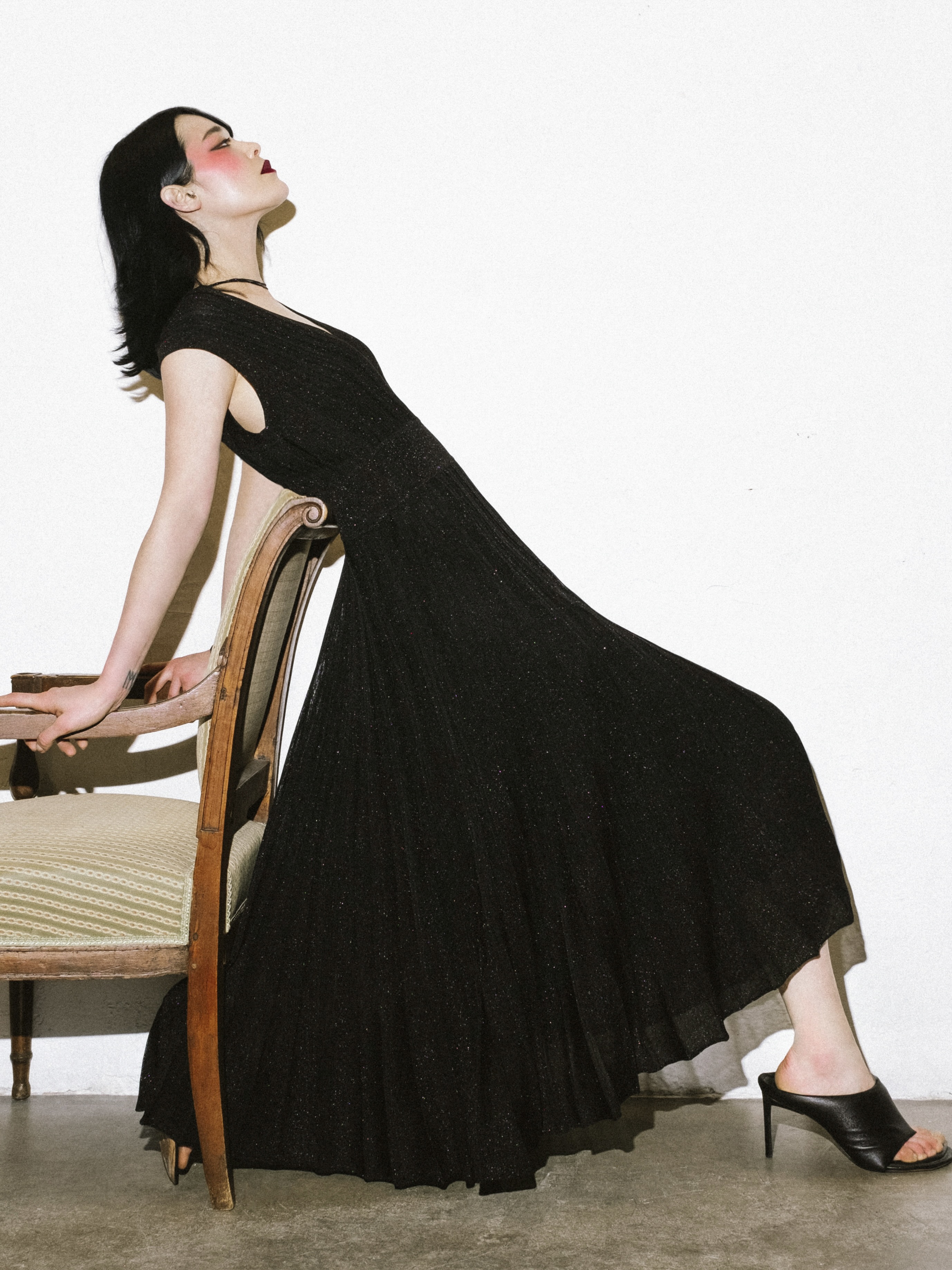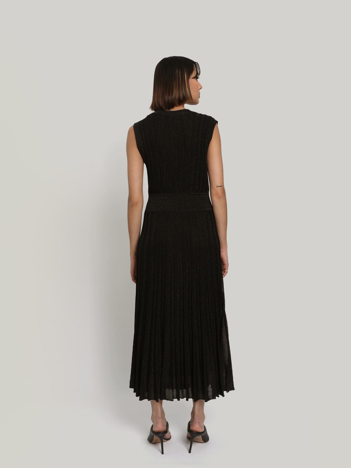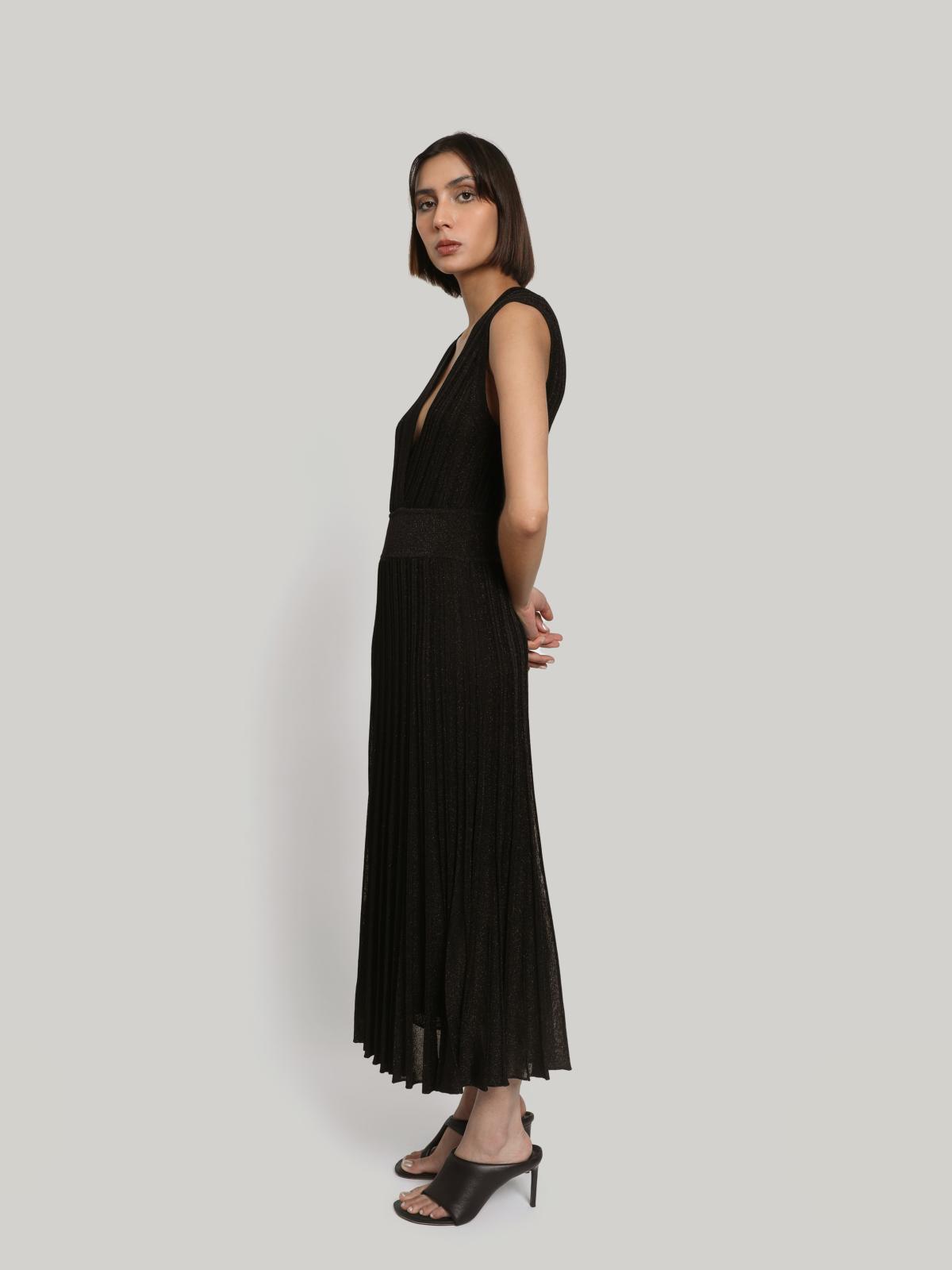 Robe longue plissée tricolore en maille Lurex®, elle possède un décolleté cache-coeur et est élastiquée à la taille.