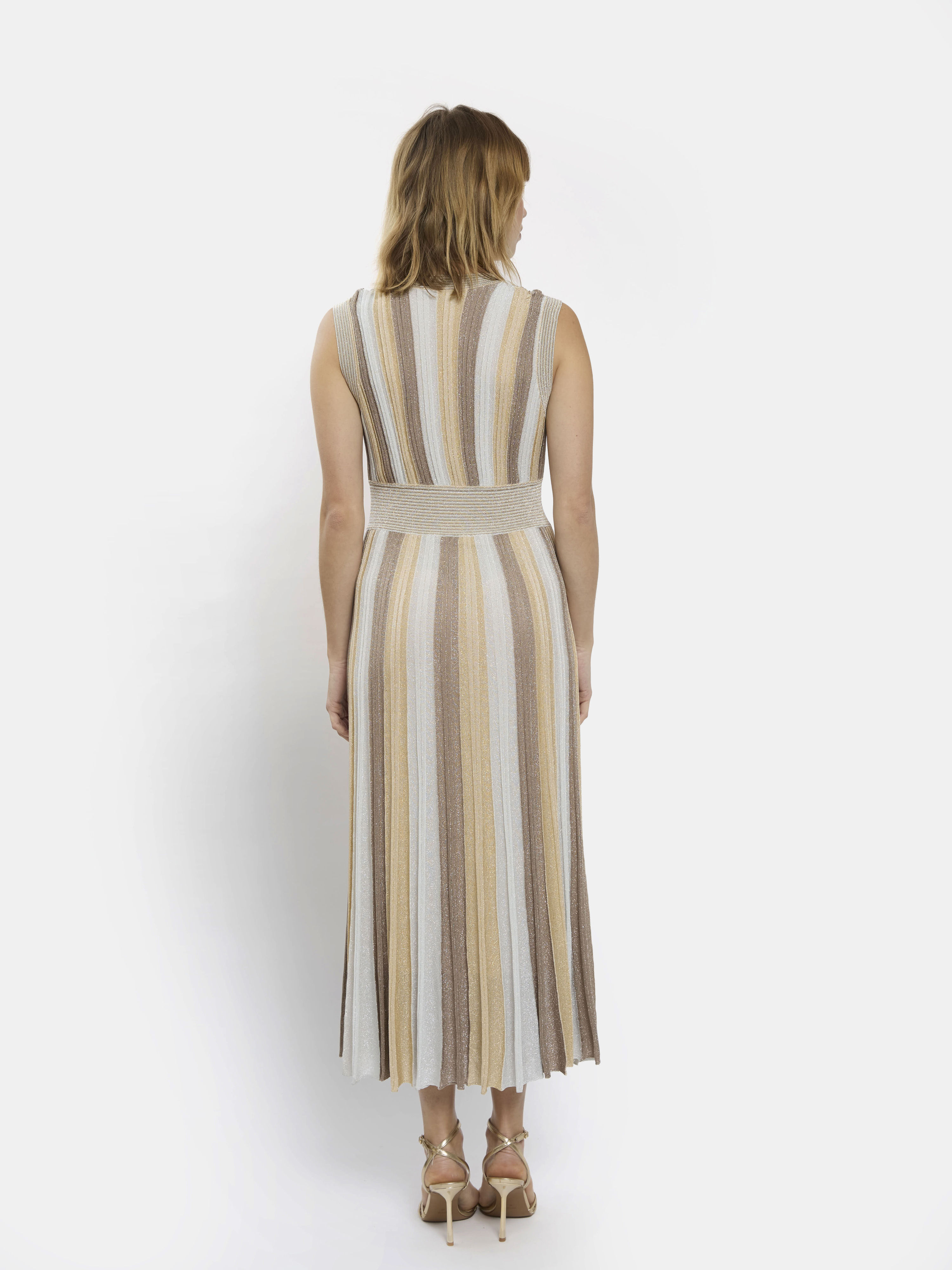 Robe longue plissée tricolore en maille Lurex®, elle possède un décolleté cache-coeur et est élastiquée à la taille.