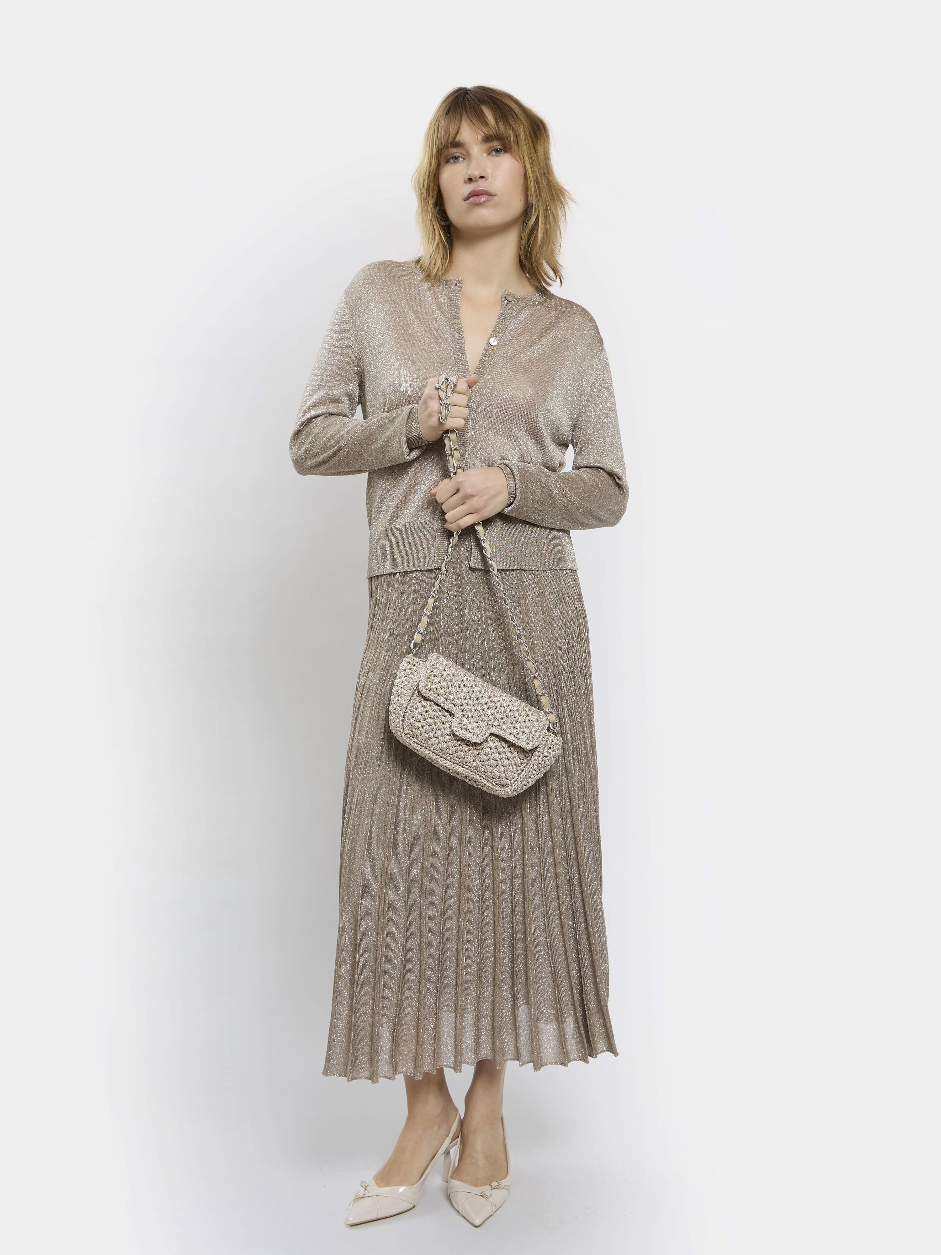 Sac à main à porter en bandoulière, crocheté à la main en Italie avec nos fils Lurex®. Il est la version mini avec chaînette longue de notre sac Fenice.