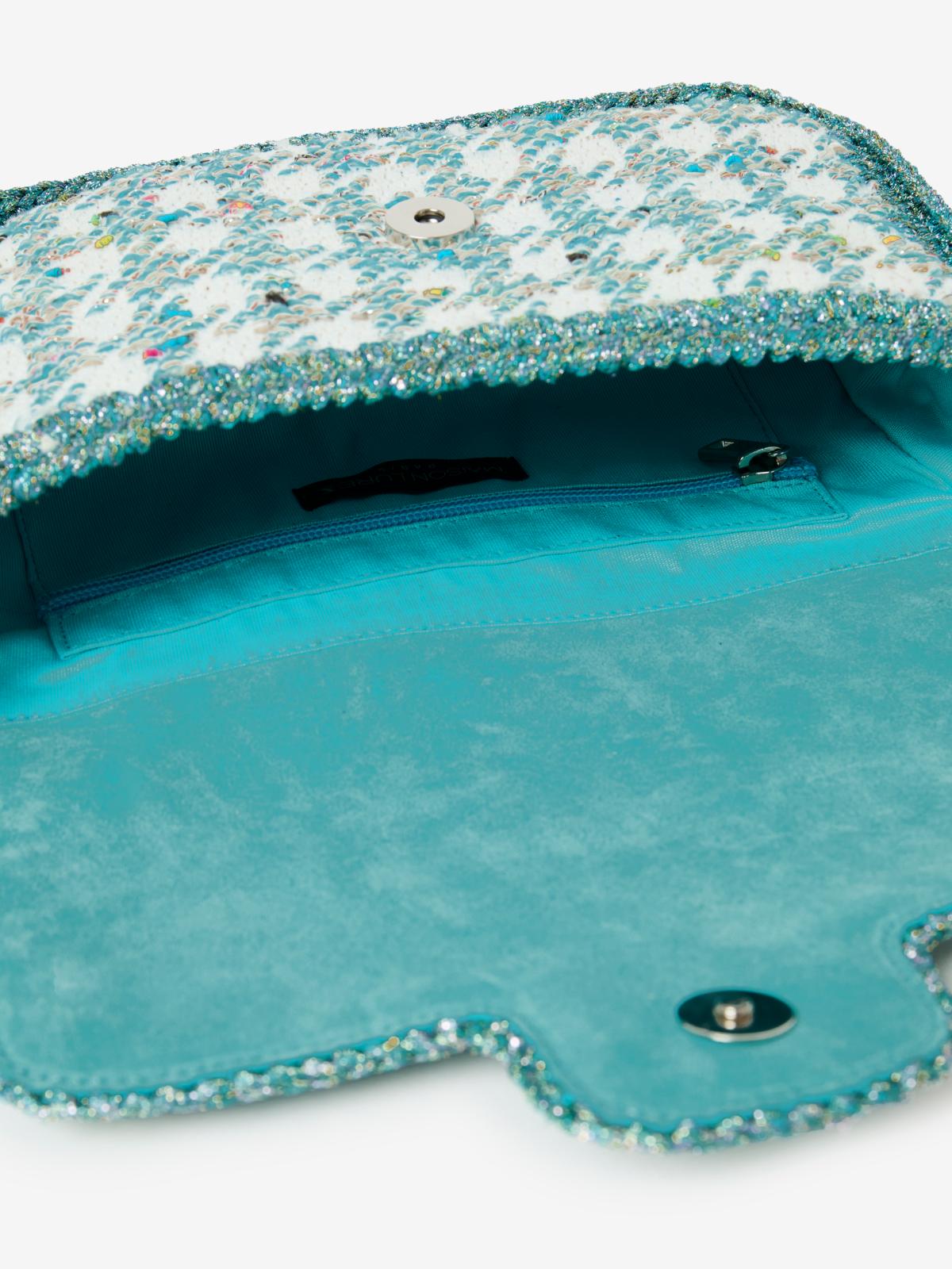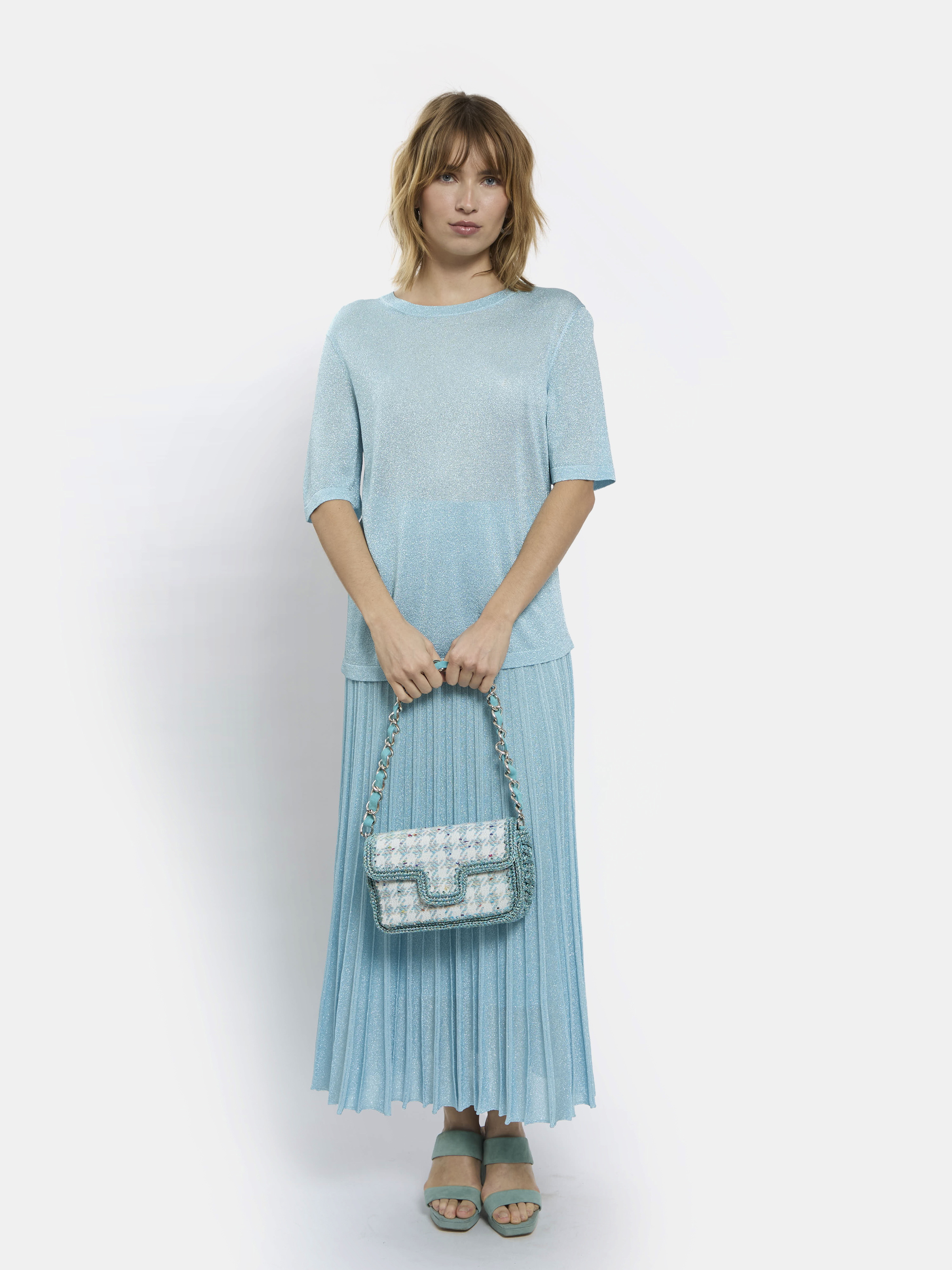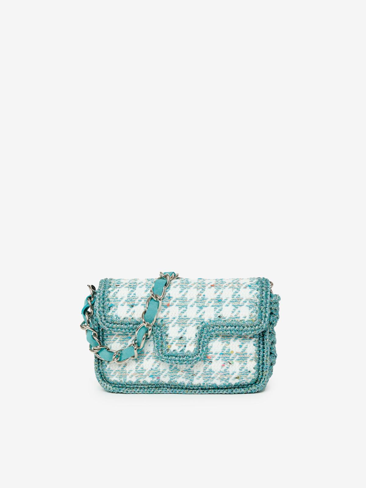 Sac à main confectionné dans un tissu français matelassé en Lurex® et crocheté à la main en Italie. Il possède une grande bandoulière en coton réglable et détachable ainsi qu’une petite bandoulière en cuir et laiton.